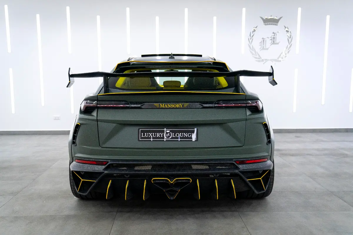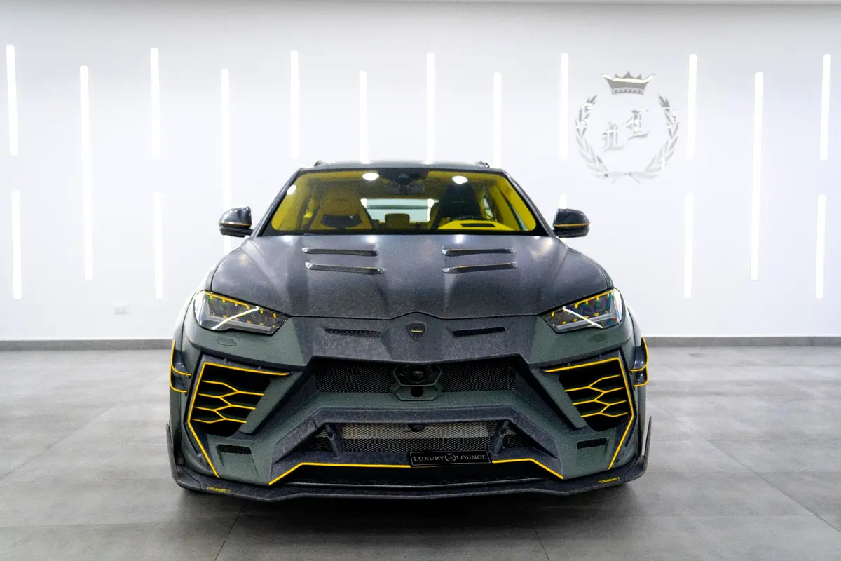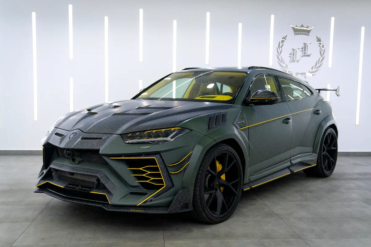 This Pre-Owned 2021 Lamborghini Urus Mansory Venatus, featuring a custom Matte Green Exterior with Yellow Accents and a striking Yellow Leather Interior with Starlight Roof, is now available for sale at Luxury Lounge car showroom on Sheikh Zayed Road, Dubai, UAE. This Urus features the Venatus Full Body Kit, dramatically enhancing its performance presence with aggressive aerodynamics, exposed carbon fiber elements, wider stance, and signature Venatus styling. The combination of Mansory craftsmanship, Lamborghini engineering, and bespoke custom touches results in a one-of-a-kind luxury SUV with supercar performance.
